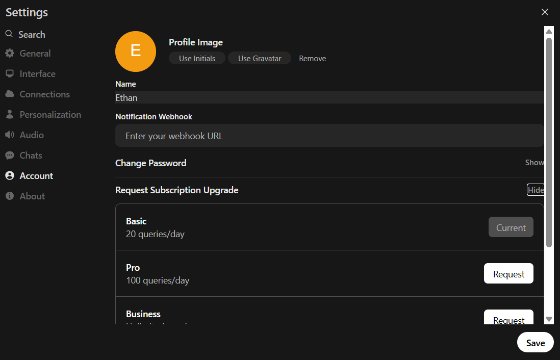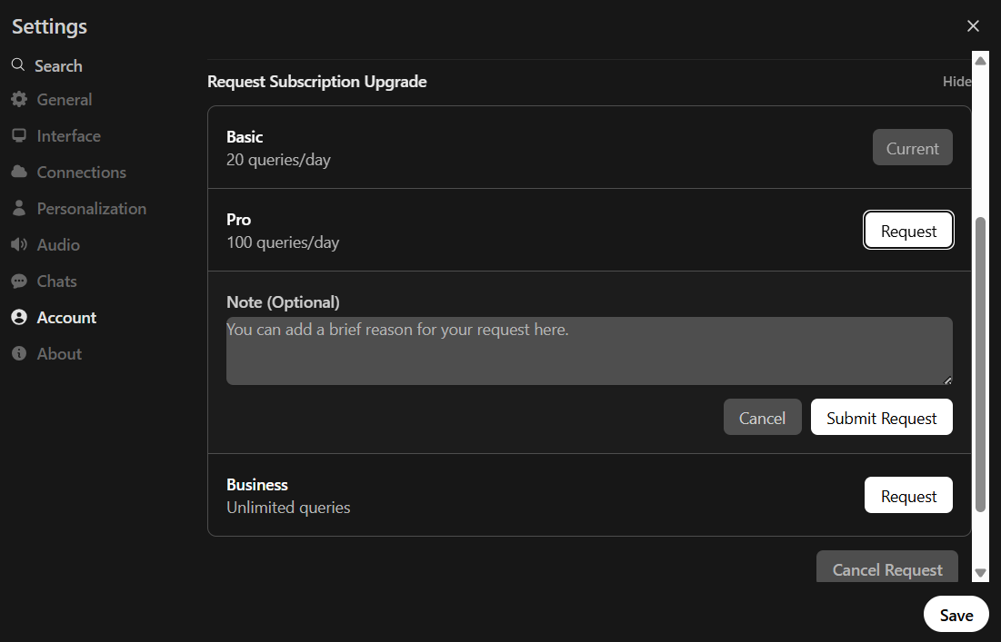Navigate to Settings > Account > Request Subscription Upgrade.